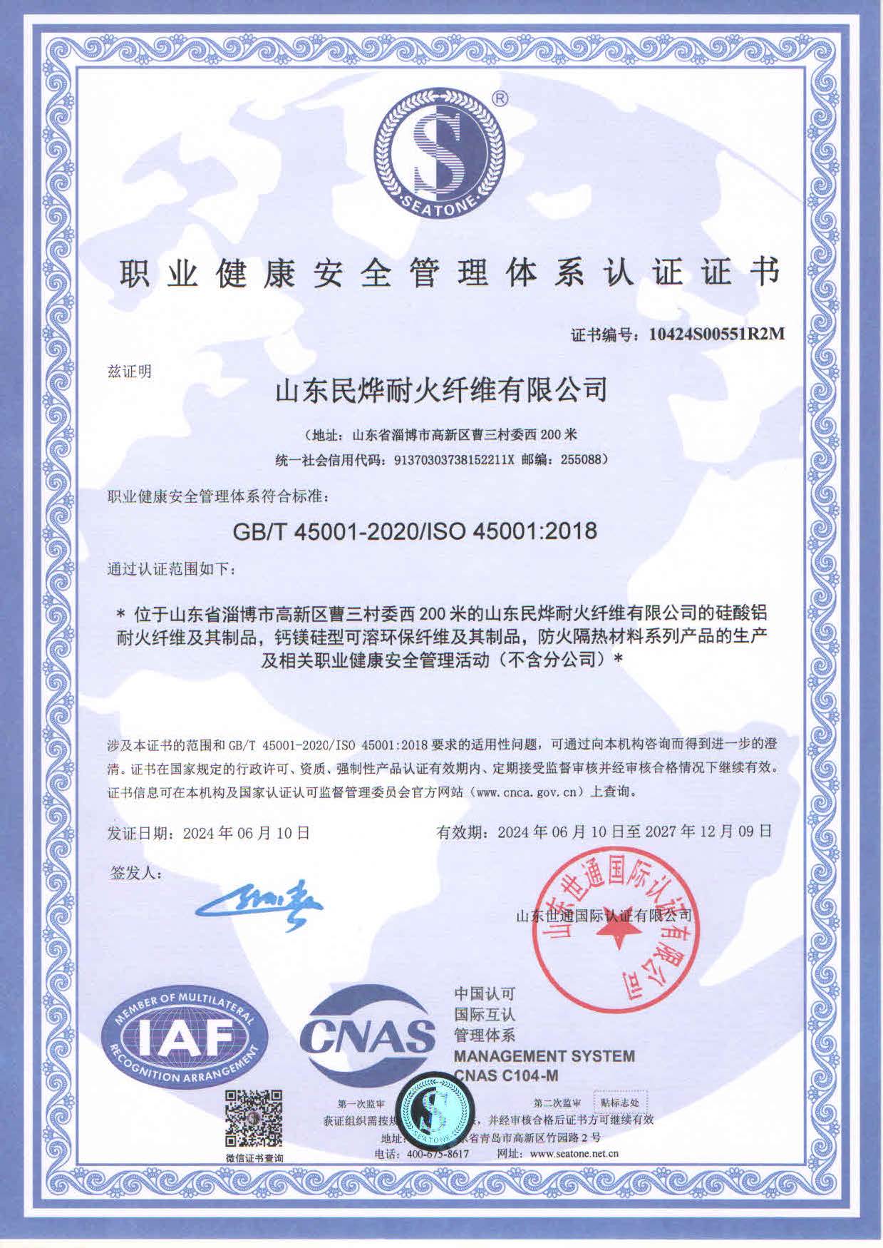 • 職業(yè)健康安全管理體系認證證書